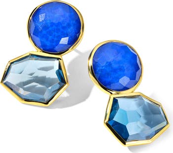 An electric pairing of blue triplets brings a wave of oceanic color to these 18-karat-gold drop earrings.