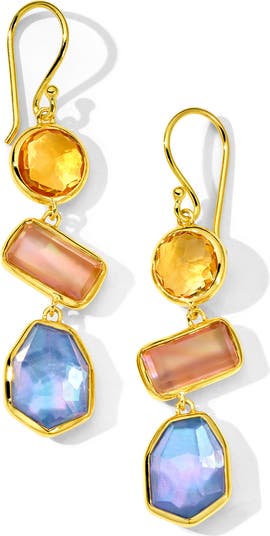 These elegant earrings offer shimmering dimension thanks to mixed-cut stations of orange citrine, brown shell doublet and lapis triplet.