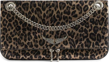 Signature wing motif hardware highlights the leopard-print metallic leather of this slender bag featuring multiple compartments and a pull-through chain strap that easily adjusts for shoulder or crossbody wear.
