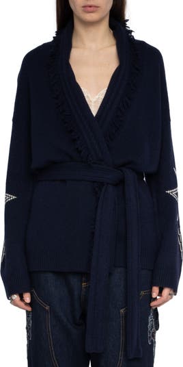This cozy wrap cardigan blends attitude with comfort, featuring a fringe-trimmed shawl collar and a tie belt. Knit from wool blended with cashmere, it's finished with Gothic lettering across the back and starburst details on the sleeves.