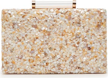 Polished pebbles create a distinctive nature-inspired design on this structured clutch furnished with a removable chain strap for hands-free versatility.
