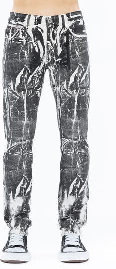 A bold print amps the attitude of low-stretch, high-intensity jeans flaunting a slim fit, a signature contrast drawcord and stitching at the back leg.