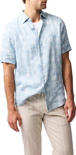 Daisies pepper a mottled background in a breathable sport shirt made from pure Italian linen.