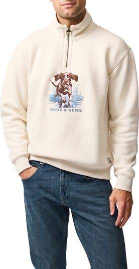 This quarter-zip sweatshirt is made from soft brushed fleece made from a sustainable cotton blend. It features an embroidered graphic of a hunting dog in motion in a nod to the brand's outdoorsman roots. Ribbed trims and a ring-pull zipper finish the look with polish.