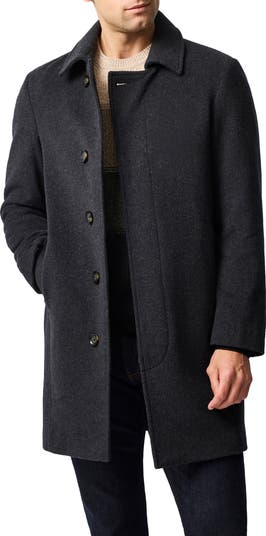 An impeccably handsome overcoat woven from incredibly dense virgin wool with a hint of cashmere maintains a clean, cosmopolitan silhouette with a concealed single-breasted closure.