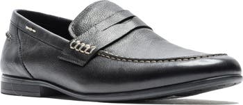 A cushy footbed gives ample support to a modern penny loafer shaped from pebbled leather for ultimate sophistication.