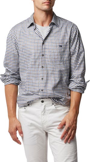 A traditional gingham in navy and brown grids a sport shirt tailored from a blend cotton and premium French linen that's pre-washed for exceptional softness.