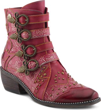 Ornate buckles and embossed, hand-painted flowers enrich this charming Western-inspired boot accented by burnished studs and rainbow stitches.