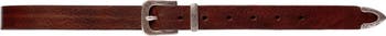 Silver plated brass with an engraved western 3 piece shaped buckle. Secured on an extra long smooth buffed leather strap.