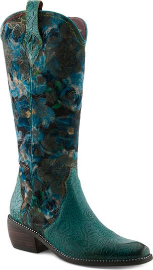 Mixed floral patterns add a dose of whimsy to a trend-right Western boot balanced by a slender round toe and stacked block heel. Plush velvet lining allows for a luxurious feel and easy on and off.