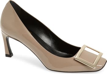 The iconic square-toe silhouette of this chic pump is set off with a polished, monogram-etched buckle and lifted by a curved Trompette heel.