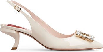One of Vivier's most famous creations, the 1963 Virgule heel, adds the maison's distinct touch to this slingback pump crowned with a crystal-embellished buckle.
