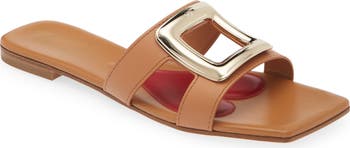 A logo-engraved buckle and heart appliqué on the footbed bring distinct signature style to this easy-on square-toe sandal crafted from Italian leather.