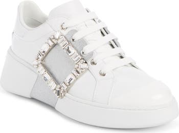 Casual streetwear meets couture heritage on a leather sneaker glammed up with glittery caging and a signature bejeweled buckle.