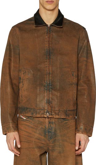 A rust wash gives the perfect aged look to this structured denim jacket trimmed with a leather collar.