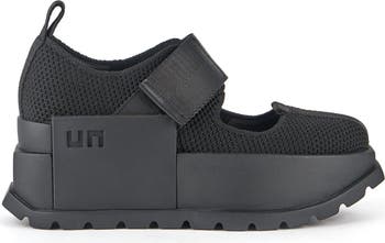 The Roko Orion is a slip-on platform sneaker lifted by a bold cleated outsole. The trans-seasonal cut-out silhouette features UN's signature aesthetics, a stretchy Mary Jane style upper with an adjustable strap, signature pull-ups, and a defining block logo.