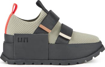 The Roko Run II is a wedge platform sneaker lifted by a bold cleated outsole. The geometric silhouette features UN's signature aesthetics, a woven fabric upper, adjustable velcro straps, signature pull-ups, and a defining block logo. Product Note: The midsole is made from polyurethane, a durable, lightweight, and flexible material with subtle micropores that will vary in texture.