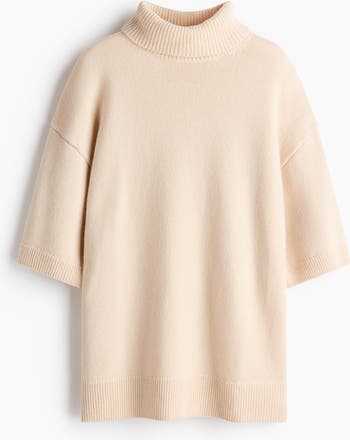 Long, oversized jumper in fine-knit wool with a ribbed roll neck, low dropped shoulders and elbow-length sleeves. Ribbing at the cuffs and hem.