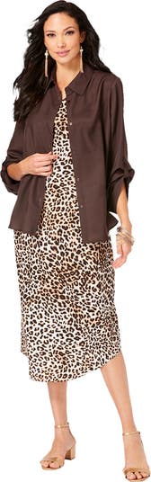 Our favorite two-piece jacket dress set, now updated with three-quarter roll-tab sleeves and a curved shirttail hem. The light and easy sleeveless dress can be worn with or without the button-front jacket, making it a perfect day-to-dinner ensemble. Scoop neck dress. Side slits.