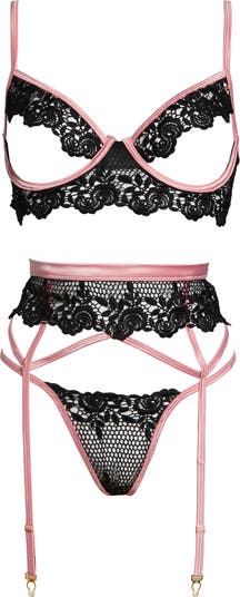 Silky satin and flirty lace work in alluring harmony on this set consisting of an open-cup bra, matching thong and garter belt.