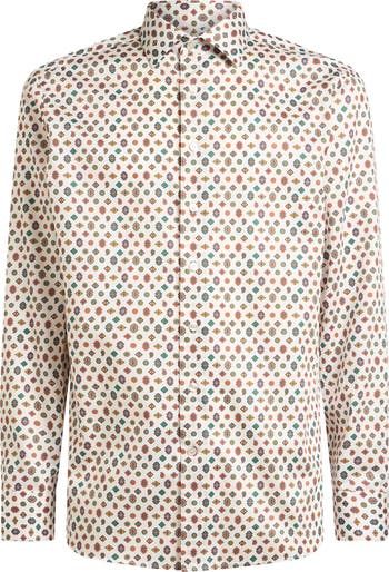 Steeped in the Italian house’s exacting tailoring, this button-up arrives in airy cotton muslin drenched with vivid motifs that seem to leap from the fabric. A crisp point collar sharpens the profile, while a curved hem keeps a clean tuck.
