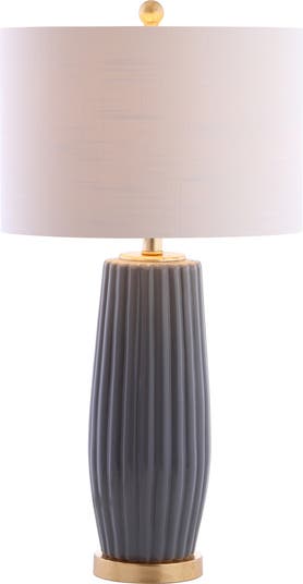 Add the finishing touch to any room in your home with this lovely fluted ceramic table lamp. Atop a brushed brass base, a solid coating of gray glaze gives this ribbed shape a high-gloss finish. Topped with a linen hardback drum shade and paired with brass fittings, the style extends all the way to the plus with a silk-wrapped cord.