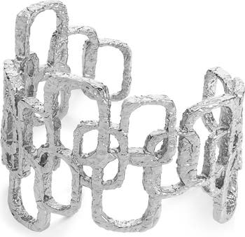 Inspired by Roman colonnades, this open cuff bracelet features arched openwork lines and hand-chiseled textures, creating a sculptural, architectural statement with vintage elegance.