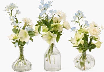 The Romance Bud Vase Set includes three mouth-blown glass bud vases, each with its own delicate shape. Perfect as small bud vases for single stems or freshly gathered flowers, they bring effortless elegance to any setting. These glass bud vases are timeless pieces to style on tables, mantels or bedside.Please note florals are for display purposes only and are not included.