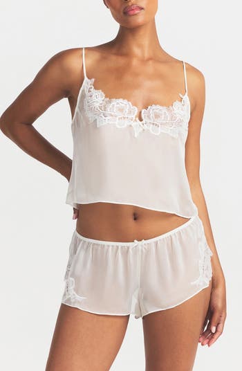 This luxe silk pajama set pairs a boxy, cropped camisole and low-rise hipster shorts with romantic lace paneling.