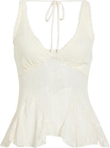 Soft lace sets the tone for this flirty sheer tank, where lined cups, lace-trimmed straps and a tie-back detail come together. A ruffled hem adds a light finish, skimming the waist with a bit of playful movement.