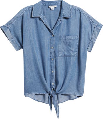 Abbreviated dolman sleeves enhance the easy drape of this lightweight denim shirt finished with a drapey tie that defines the silhouette.