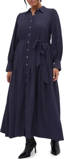 Iridescent buttons trace the front of a maxi-length shirtdress cut from flowy fabric shaped by an adjustable tie belt at the waist.