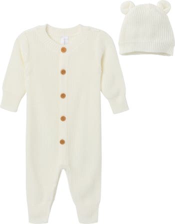 Crafted from thick, warm material with a hint of stretch, our charming baby romper and hat set offer both comfort and durability for your active baby. With hidden snaps at the inseam, dressing and diaper changes are quick and easy, while comfort-stretch ribbing at the neckline, wrists, and ankles ensures a snug and flexible fit. Perfect for indoor play or outdoor adventures, the cozy matching hat provides extra warmth and style. Complete with faux wood buttons for a sweet finishing touch, this set is sure to become a favorite in your baby's wardrobe. Our essentials have been independently certified with STANDARD 100 by OEKO-TEX® so that you don’t have to worry about harmful substances in your little one’s wardrobe. Pack includes one romper and one cap.