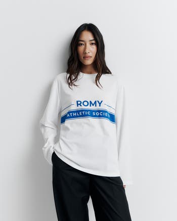 Classic long sleeve crew neck boyfriend tee featuring the Romy Athletic Society print.