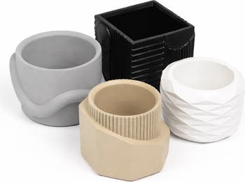 A curated exploration of geometric form, this handmade concrete vase set brings sculptural artistry to compact silhouettes. Each piece showcases a distinct architectural profile, from faceted planes to linear ridging and softly contoured curves. Unified by a smooth matte finish, the quartet creates a dynamic yet balanced composition rooted in modern minimalism.