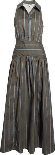 Timeless stripes lend classic charm to this sleeveless dress cut from comfortable stretch cotton. A crisp spread collar and button placket keep it polished, while subtle waist ruching, a curved yoke and a full skirt create a graceful silhouette.