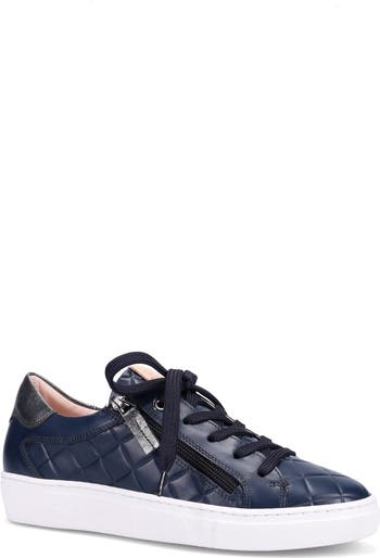 Diamond quilting and metallic accents enrich this leather sneaker that delivers targeted comfort via a cushioned insole with arch support and a metatarsal cushion.