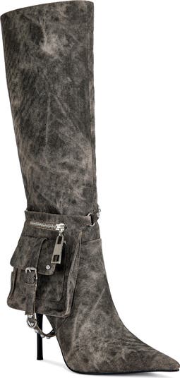 Zip and buckle details amplify the motoo style of this knee-high boot complete with a stiletto heel and pointy toe.