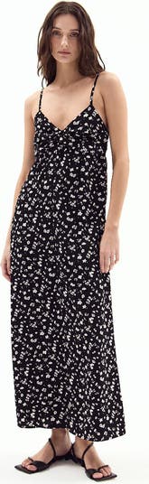 A twisted neckline enhances the texture and shape of this figure-skimming maxi covered in delightful blooms.