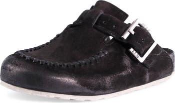 Whipstitch trim and buckle hardware amplify the everyday appeal of this distressed suede mule complete with a cushioned footbed and flexible rubber sole.