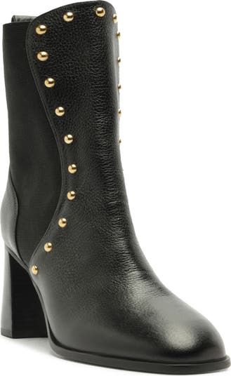 Glinting studs highlight the richly textured leather of a Brazilian-made Chelsea boot featuring a softly squared toe and stacked heel for poised balance.