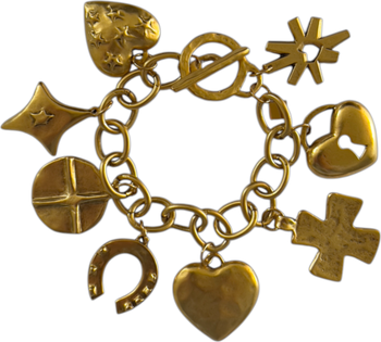 Rooney, Rooney, Rooney - she's that girl! Charms on charms on charms! This beautiful chunky charm bracelet features a 7.5” 12k antiqued gold plated stainless steel bracelet with an oversized 12k antiqued gold plated pewter toggle clasp. Hanging from it are several 12k antiqued gold plated pewter charms that resemble collected memories <3 Wait until you hear the song these charms sing!