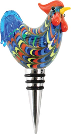 Our vibrantly hued glass rooster crows a cheery greeting while adding a lively splash of color to your country kitchen. With three rubber rings around its base, this detailed glass art piece will stand tall and steady atop any standard bottle while keeping your wine fresh.
