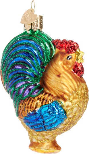 Add a vibrant touch to your holiday decorations with this glitter-trimmed, hand-painted rooster glass ornament.