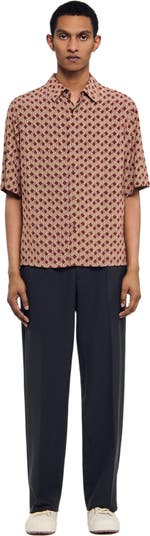 Flowing printed shirt adorned with a rope motif, featuring a broken collar, short sleeves, and button fastening.