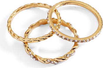 Add a little sparkle with this stacking ring trio! The first ring features a delicate rope texture, the middle shines with clear crystal pavé, and the third combines rope texture and pavé for extra flair. This ready-to-wear set makes stacking rings fun and hassle-free—because why guess when you can glow?