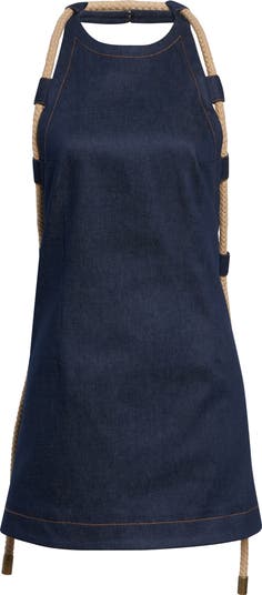 This open-back denim A-line dress is shaped with a high halter neckline and contrast topstitching that traces the silhouette. Nautical braided rope straps frame the shoulders, introducing textural contrast against the clean, structured lines.
