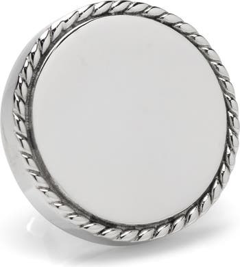 An etched rim encircles a luminous stainless-steel center, creating a refined lapel pin that complements any formal look.
