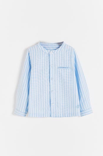 Shirt with a mandarin collar, made of striped cotton in shades of light blue and white, with buttons down the front. Its quality provides softness and comfort for skin care. A lovely piece to wear.