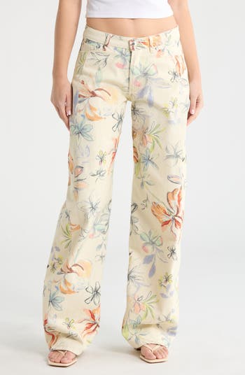 Enchanting sketched blooms add charm to these high-waist jeans made from nonstretch denim and cut with curved barrel hems.